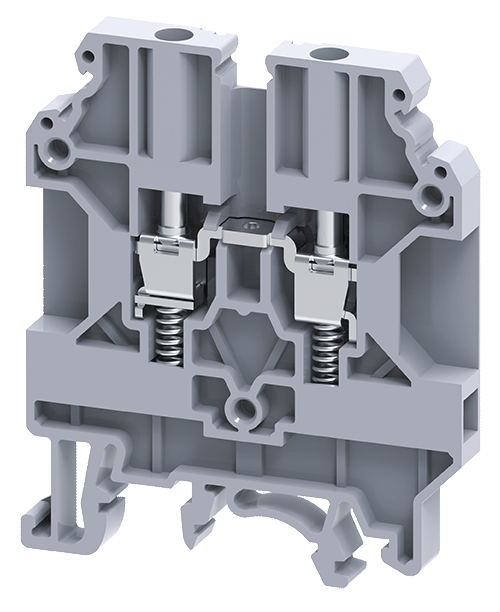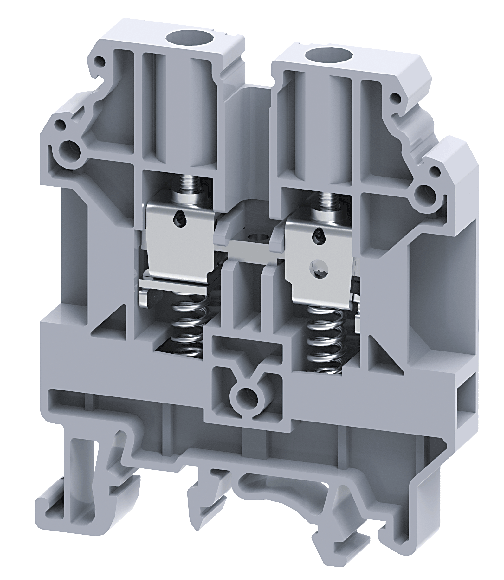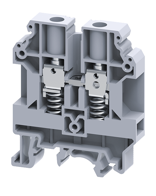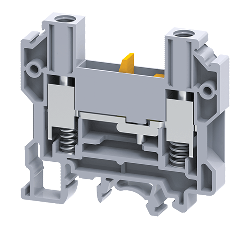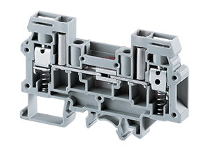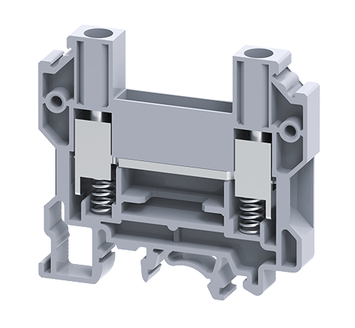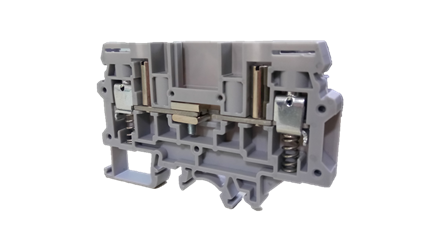 • These modified version of feed through Terminal Blocks come with springs below the clamps. These Terminal Blocks are preferred for connections that involve safety requirements of the Electric Supply Industry (ESI) standards, British CEGB regulations and NTPC applications. In addition to the high torque screws, these blocks have a built-in spring loading feature.